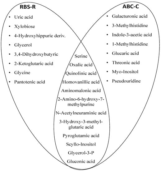 Venn diagram illustrating the top 25 metabolites shared between groups and discriminant ASD children with severe impaired behaviors from those with mild-to-moderate impaired behaviors. The visualization of the common metabolic content is suggestive to the presence of the perturbed pathways such as oxidative stress, gut dysbiosis and purine metabolism. The most perturbed pathways shared by the two scales (RBS-R and ABC-C) were glycine, serine, and threonine metabolism, tryptophan metabolism, oxidative stress, mitochondrial energy supply, and purine metabolism.