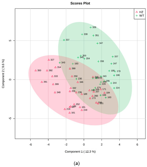 WT vs. HZ: After a preliminary outlier removal, the groups resulted formed by 29 WT and 31 HZ. Univariate analysis did not reveal any significant metabolite. Partial least square discriminant analysis (PLS-DA) analysis allowed to build a statistically validated model (p < 0.01): the relative two-dimensional (2D) score plot and the corresponding VIP (Variable Importance in Projection) score were plotted and are reported in Figure 1a,b, respectively.