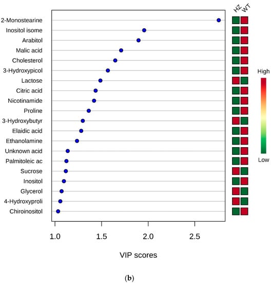 PLS-DA analysis of WT vs. HZ. (a) Two-dimensional (2D) score plot, and (b) the corresponding VIP score plot (score > 1.0).