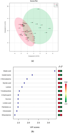 PLS-DA analysis of HZ vs. KO. (a) 2D scores plot, and (b) the corresponding VIP score plot (score > 1.0).