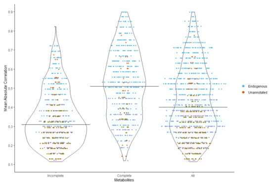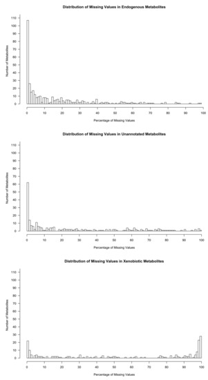 - For each metabolite the missing values are replaced (“imputed”) with a single value, such as the minimum detection level or half the minimum detection level. This approach results in overrepresentation of a single value in the population distribution. This may affect subsequent analyses and may cause biased results, regardless of the cause of missing values [5,6]. Furthermore, metabolites could be missing in some individuals because they are not biologically present in their system. Therefore, imputing these missing values will cause bias in the analysis. For example, if the metabolites for metformin are imputed, both diabetic patients who use the drug as well as and non-diabetic individuals who do not use the drug will have values for the it. This is a prominent issue in platforms such as Metabolon™ (Metabolon Inc., Durham, NC, USA) that include xenobiotic metabolites (e.g., metabolites from external sources such as medications).