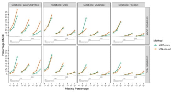 - Do, K.T.; Wahl, S.; Raffler, J.; Molnos, S.; Laimighofer, M.; Adamski, J.; Suhre, K.; Strauch, K.; Peters, A.; Gieger, C.; et al. Characterization of missing values in untargeted MS-based metabolomics data and evaluation of missing data handling strategies. Metabolomics 2018, 14, 128. [Google Scholar] [CrossRef]
