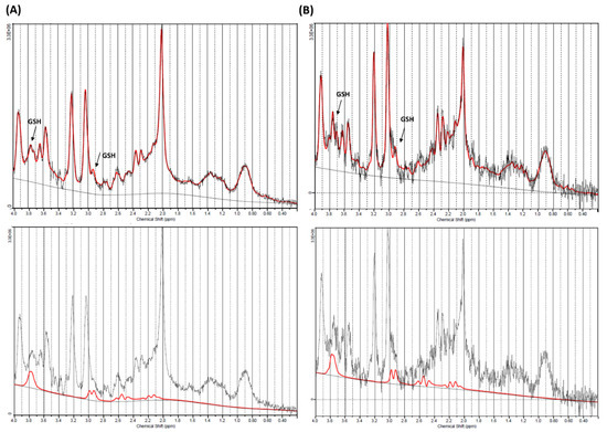 Magnetic resonance (MR)-spectrum obtained within ganglio-capsular volume of interest (VOI) for a control (A) and a Ketogenic Diet (KD) patient (B). Composite spectrum (above) presents glutathione (GSH) peaks of approximately 2.95 and and 3.75 ppm (black arrow), that are more visible on the GSH fitting spectra (below).