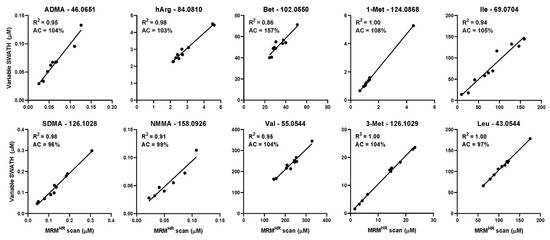 Correlation (R2) and accuracy (AC) of the quantification values of 10 structural isomers in 10 volunteers. Each data point represents the analyte concentration quantified by MRMHR and variable SWATH. The quantification values of the best performing product ion are depicted in the graph. NMMA was not detected in three volunteers.