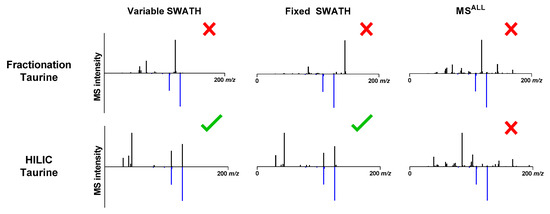As shown in Figure 4, MS/MS spectra become more complex with increasing Q1 window sizes, which is clearly demonstrated by a comparison of the SWATH and MSALL spectra. This explains the fact that MSALL only allowed for the unequivocal identification of nine and 13 of the 20 compounds in the fractionation and HILIC method, respectively. The identification of taurine in Figure 4 illustrates the problems of coelution and large window sizes because only a HILIC separation using SWATH resulted in a correct identification. Although the two most abundant MS/MS peaks of the library spectra were present in all DIA-acquired spectra, these peaks were overshadowed by numerous other higher intensity peaks. This obstructed the correct identification of taurine.