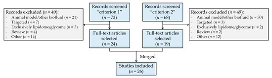 Flow diagram of literature selection and review process. Search “criterion 1”: term (“human milk” OR “breast milk”), AND “metabolom*”, AND “infant”; only articles. Search “criterion 2”: term (“human milk” OR “breast milk”), AND “metabolom*”, AND (“GC” OR “LC” OR “NMR” OR “CE”); only articles. Web of Science database was employed for literature search.