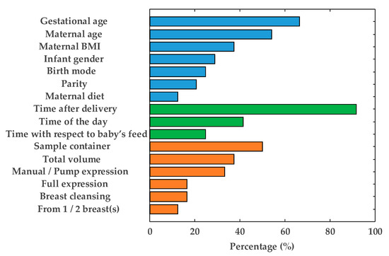 The information regarding study design provided in HM metabolomics studies varies considerably [13,14,15,16,17,18,19,20,21,22,23,24,26,27,28,29,30,31,32,34,35,36,45,46,47] as shown in Figure 2. Repeatedly reported factors have been grouped into three categories and are discussed in detail in the following sections: (1) maternal-infant-related factors (blue bars), (2) time-related factors (green bars), and (3) HM collection-related factors (orange bars). It should be noted that, although the importance of each factor might vary with the scientific question of each study, the authors encourage (i) the use of SOPs employed during sample collection to assure homogenous and representative sampling and (ii) the reporting of all documented factors in order to enhance comparability between results of metabolomic studies on HM. In case of HM, samples are typically collected, handled and sometimes temporary stored and transported by the mothers and not, such as it is the case for other biofluids (e.g., plasma or serum), by health professionals. During study design it is therefore very important to assure that mothers receive detailed instructions and/or training for the correct handling of collected samples. In addition, one should keep in mind that sampling protocols should neither interfere with infant feeding nor negatively impact on the mother-baby bonding. Hence, the collection of transitional and mature milk is usually preferred over colostrum, especially in studies involving mothers of preterm infants, where colostrum is usually kept exclusively for the infant’s supply.