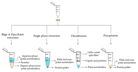 For metabolite extraction from HM, an array of methods has been reported. An overview of the employed approaches is shown in Figure 3. The selection of the extraction method is conditioned by the study objective and the subsequent analysis method. As in other untargeted metabolomics workflows, for HM metabolomics, the selected sample preparation approach should enable a high degree of metabolome coverage while making the sample matrix compatible with the analytical platform. Other considerations might include the available amount of sample volume and the use of one sample extraction procedure for subsequent analysis by multiple, complementary analytical platforms [13,27,28].