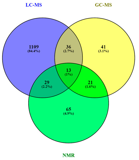 A comprehensive list of annotated and/or identified metabolites in HM from untargeted metabolomics studies [14,15,17,18,19,21,22,23,24,25,26,27,28,29,31,32,33,34,35,36] is reported in Table S1. This table contains information about the metabolites reported in each reference, such as their molecular formula, IDs (LipidMAPS and/or HMDB IDs), the extraction procedure performed, the analytical platform used, and the detected metabolite class. Readers can select metabolites dynamically by filtering data according to the latter information. A total of 1187, 111, and 128 metabolites were reported using LC-MS, GC-MS, and NMR, respectively (see Figure 4). As shown in the Venn diagram, LC-MS and GC-MS allowed the detection of 36 common metabolites (mainly carbohydrates and FAs); a total of 29 metabolites overlapped between LC-MS and NMR (principally oligosaccharides); and 21 metabolites (predominantly amino acids and organic acids) were commonly reported in GC-MS and NMR based studies. Only 13 metabolites were reported by all three platforms, i.e., creatine, tyrosine, arabinose, galactose, glucose, lactose, maltose, capric acid/caprate, caprylic acid/ caprylate, citric acid/citrate, pyruvic acid/pyruvate, hippuric acid/hippurate, and myo-inositol. These metabolites were assigned to different classes including amino acids, carbohydrates, FAs, and organic acids.