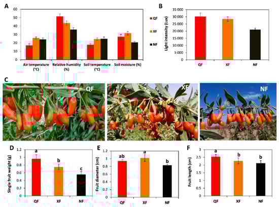 Differences in size of fruits from the three producing areas were also investigated during the ripening period. Overall, fruits from QF were the biggest followed by those from XF and the smallest fruits were obtained in NF (Figure 1C–F). These results proved that climatic conditions had significant effects on wolfberry fruit size.