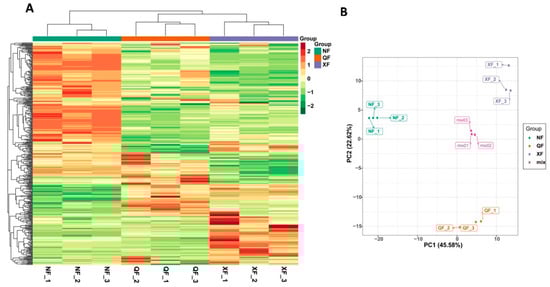 Overview of global metabolic profiles in wolfberry fruits collected from three planting areas. (A) Heatmap hierarchical clustering and (B) principal component (PC) analysis. NF, XF and QF represent Ningxia, Xinjiang and Qinghai planting areas, respectively. Mix represents the mixed samples used for quality control. Data shown are the log2 fold change of the metabolite ion intensity.