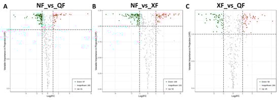 Volcano plots depicting the up- and down- accumulated metabolites between pairs of samples from different growing regions. (A) between NF and QF; (B) between NF and XF; (C) between XF and QF. Compounds with variable importance in projection (VIP) ≥ 1 and fold change ≥2 or fold change ≤ 0.5 were declared significant. QF, NF and XF represent Qinghai, Ningxia and Xinjiang locations, respectively.