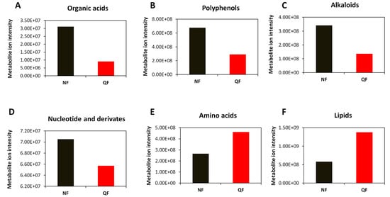 Comparison of the total ion intensity of various classes of metabolites between fruits from Ningxia (NF) and Qinghai (QF). (A) Organic acids, (B) polyphenols, (C) alkaloids, (D) nucleotides and derivatives, (E) amino acids and (F) lipids. Bars represent the sum of ion intensity of all metabolites belonging to each class.