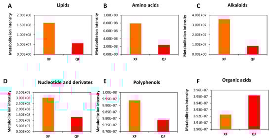 Comparison of the total ion intensity of various classes of metabolites between fruits from Xinjiang (XF) and Qinghai (QF). (A) Lipids, (B) amino acids, (C) alkaloids, (D) nucleotides and derivatives, (E) polyphenols and (F) organic acids. Bars represent the sum of ion intensity of all metabolites belonging to each class.