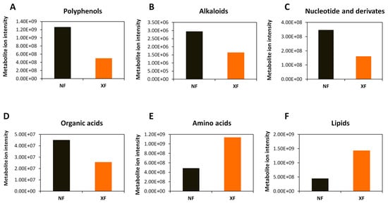Comparison of the total ion intensity of various classes of metabolites between fruits from Ningxia (NF) and Xinjiang (XF). (A) Polyphenols, (B) alkaloids, (C) nucleotides and derivatives, (D) organic acids, (E) amino acids and (F) lipids. Bars represent the sum of ion intensity of all metabolites belonging to each class.