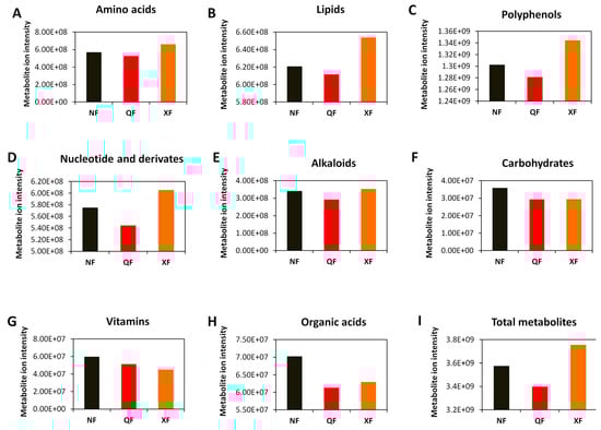 Comparison of the total ion intensity of various classes of metabolites between fruits from Ningxia (NF), Qinghai (QF) and Xinjiang (XF). (A) Amino acids, (B) lipids, (C) polyphenols, (D) nucleotides and derivatives, (E) alkaloids, (F) carbohydrates, (G) vitamins, (H) organic acids and (I) total metabolites. Bars represent the sum of ion intensity of all metabolites belonging to each class.