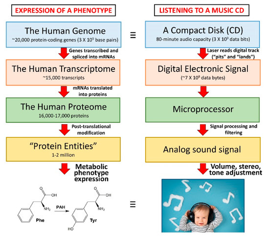 The expression of phenotypes, including metabolic phenotypes, from a genomic sequence that is transcribed, spliced, and translated to protein with potential post-translational modifications, is analogous to the information flow involved when listening to a music compact disk or some other digital music format. In the former case, the genome is analogous to the compact disk itself, which without the apparatus for converting it to sound, is simply a digital storage system (Figure 1). This is why the metabolic phenotype is more revealing of the status of a cell, tissue, or organism than a genetic sequence, because it more resembles the musical experience rather than analyzing the so-called pits and lands (Figure 1) on a CD.