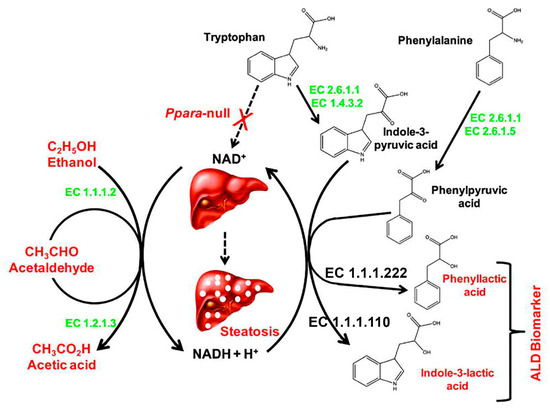 The above studies of the effect of alcohol administration were highly targeted, and therefore, limited in their description of the hepatic metabolic phenotype induced by alcohol. They were also limited by the vastly different protocols of ethanol administration. A study in mice was conducted using the Lieber-Decarli diet treated wild-type (WT) and Ppara-null mice (PPARα is a nuclear receptor that regulates much of lipid metabolism including fatty acid β-oxidation) [58]. Six months’ chronic alcohol exposure led to increased hepatic triglyceride accumulation in the Ppara-null mice. Urines collected from 2 to 6 months were analyzed using an untargeted metabolomic protocol by UPLC-ESI-QTOFMS, and showed differential elevated metabolite profiles for the WT and null mice. In WT mice, the principal elevated urinary metabolites resulting from alcohol administration were ethyl sulfate and ethyl-β-D-glucuronide, secondary metabolites of ethanol, together with 4-hydroxyphenylacetic acid and its sulfate conjugate. These were also found for the null mice and, in addition, elevated urinary excretion of indole-3-lactic acid was found only in the Ppara-null mice, which was mechanistically related to the administration of ethanol in these animals. In a subsequent and more detailed investigation [59] that used WT and Ppara-null mice with two different strain backgrounds, indole-3-lactic acid and phenyllactic acid were reported as ALD biomarkers, with their formation arising from their corresponding pyruvic acids having been driven by the NADH hepatic overload due to ethanol consumption (Figure 2). The mechanism-based biomarkers also shed light on the development of steatosis, driven by the deficit in NAD+ and the hepatic increase in NADH. The redox inhibition of fatty acid β-oxidation is an initial step of triglyceride and lipid droplet accumulation in the liver [52]. Metabolomic investigations in rats fed the Lieber-DeCarli liquid diet for 2 and 3 months have been conducted using high-field 1H and 31P NMR. These studies reported a two-fold increase in plasma triglycerides and a halving of plasma free fatty acids, mirroring smaller but statistically significant changes in the liver. Both total and free cholesterol were increased two-fold in the liver [60]. Metabolomics has identified specific lipids in serum that were associated with alcohol-induced liver diseases, specifically, N-lauroylglycine identified cirrhosis with 100% sensitivity and 90% specificity, while decatrienoic acid could evaluate liver disease severity with 100% sensitivity and specificity [61].