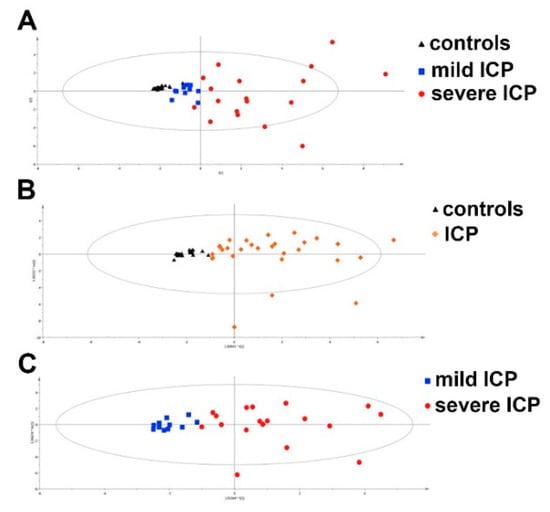 (A) PCA scores plot for controls vs. mild ICP vs. severe ICP; (B) OPLS-DA scores plot for controls vs. ICP; (C) OPLS-DA scores plot for mild ICP vs. severe ICP. Note the data clustering and separation (taken from Li et al., 2018 [112] with permission).