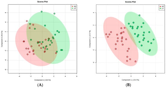 Partial least squares discriminant analysis (PLS-DA) obtained from employing the metabolic concentration of all metabolites detected in the muscle tissue of animals according to: (A) Growth: high growth (HG) and low growth (LG) animals are represented by the red and green colors, respectively; and (B) Precocity: high precocity (HP) and low precocity (LP) animals represented by the red and green colors, respectively. The validation analysis for growth resulted in the R2 = 0.427, Q2 = 0.105, and Accuracy = 0.64 (Figure S1: Validation statistics for PLS-DA on animals selected for growth); for precocity, R2 = 0.795, Q2 = 0.523, and Accuracy = 0.92 (Figure S2: Validation statistics for PLS-DA on animals selected for precocity).