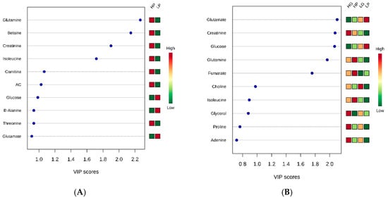 Variable importance in projection (VIP) plot value analyses obtained from (A) high precocity (HP) and low precocity (LP) animals; and (B) high growth (HG), high precocity (HP), low growth (LG), and low precocity (LP) animals. AC: Acetylcarnitine.
