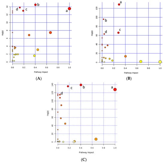 Metabolomics pathways of the meat extract revealed significant differences in the drawn pathway according to (A) Precocity: high precocity (HP) and low precocity (LP); (B) Selection traits: Growth and Precocity; and (C) Intensity of selection: High and Low. In the scatter plot, the x-axis indicates the impact on the pathway whereas the y-axis indicates significant changes in the pathway by detected metabolites. Darker color and larger size represent higher p-values from the enrichment analysis and greater impact from the pathway topology analysis, respectively.