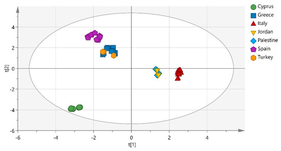 The permutation plot (Figure 5) assesses the risk that the obtained PLS is valid and predicts well for new observations; intercepts R2 = (0.0, 0.18) and Q2 = (0.0, −0.425). The model’s efficiency was defined by the goodness-of-fit R2 = 0.95%, whereas predictive ability by Q2 = 0.98. The model has been confirmed using cross validation-analysis of variance (CV-ANOVA), with a p-value < 4.35 × 10−5. The misclassification table presented in Table 3 was calculated for validation purposes. The samples of different geographical origins were discriminated with 78% success in total and the Fisher’s probability is highly satisfactory (3.7 × 10−7 < 0.05).