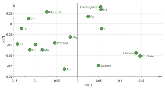PCA scatter plot (Figure 1) shows a clear separation of carob seeds from flesh samples based on the highest values of proteins, dietary fibers, fat, Ca, Zn, ash, Cu, Mn, P, Fe, Mg and the lower values of moisture, K, Na, sucrose, glucose, fructose.