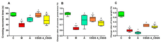 The results of behavioral tests and body weight in different treatment groups of rats: (A) the number of rearing and crossing; (B) the sucrose preference; (C) the body weight changes. C: control group; M: chronic variable stress (CVS) model group; A: Antibiotic treated group with CVS; CSGS: Chaihu-Shu-Gan-San (CSGS) treated group; A_CSGS: Antibiotic + CSGS treated group. * p < 0.05 vs. C; # p < 0.05 vs. M; & p < 0.05 vs. CSGS. The post hoc analysis of variance (ANOVA) used for statistical analysis and data with different superscript letters are significantly different.