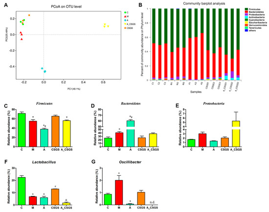 Principal coordinate analysis (PCoA) scatter plot of operational taxonomic units (OTUs) (A) and relative gut microbiota abundance at the phylum (B–E) and genus level (F,G) in different treatment groups of rats. C: control group; M: CVS model group; A: Antibiotic treated group with CVS; CSGS: CSGS treated group; A_CSGS: Antibiotic + CSGS treated group. * p < 0.05 vs. C; # p < 0.05 vs. M; & p < 0.05 vs. CSGS. n.d. indicates not detected. The post hoc ANOVA used for statistical analysis and data with different superscript letters are significantly different.