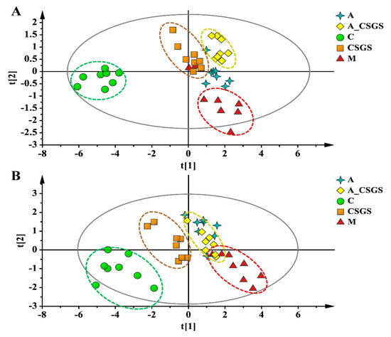 PCA score plot of hippocampus samples collected from different treatment groups of rats in (A, R2X = 0.761, Q2(cum) = 0.543) positive and (B, R2X = 0.831, Q2(cum) = 0.521) negative ion mode. C: control group; M: CVS model group; A: Antibiotic treated group with CVS; CSGS: CSGS treated group; A_CSGS: Antibiotic + CSGS treated group.