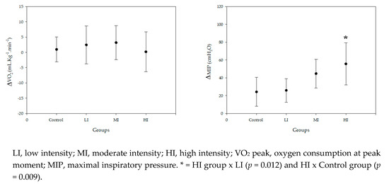 - Neves, L.M.T.; Karsten, M.; Neves, V.R.; Beltrame, T.; Borghi-Silva, A.; Catai, A.M. Relationship between inspiratory muscle capacity and peak exercise tolerance in patients post-myocardial infarction. Heart Lung 2012, 41, 137–145. [Google Scholar] [CrossRef] [PubMed]