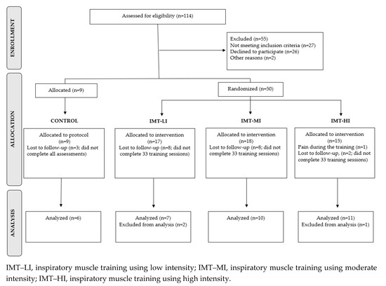 - Archiza, B.; Andaku, D.K.; Caruso, F.C.R.; Bonjorno, J.C.; de Oliveira, C.R.; Ricci, P.A.; do Amaral, A.C.; Mattiello, S.M.; Libardi, C.A.; Phillips, S.A.; et al. Effects of inspiratory muscle training in professional women football players: a randomized sham-controlled trial. J. Sports Sci. 2018, 36, 771–780. [Google Scholar] [CrossRef] [PubMed]