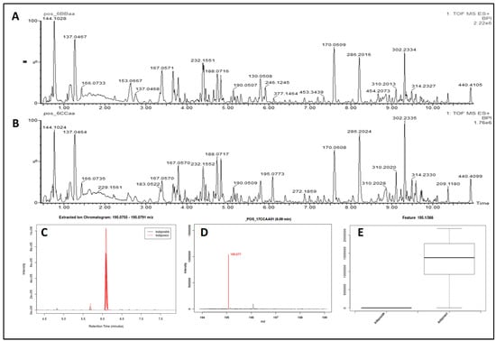 A–E. Exemplary UPLC-QTOF MS profiling in ESI+ mode and results obtained by means of the XCMS Online. (A) The base peak intensity chromatogram (BPI) of a urine sample of a woman after implementation of the dietary recommendations; (B) BPI chromatogram of a urine sample of a woman after implementation of the dietary recommendations and beetroot juice supplementation; (C) the extracted ion chromatogram: 195.0755–195.0791 m/z; (D) the mass spectrum at 6.09 min selected to highlight the peak for 195.0772 m/z, which represent the M+K[1+] species; (E) the box-and-whisker plot for that metabolic feature.