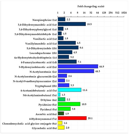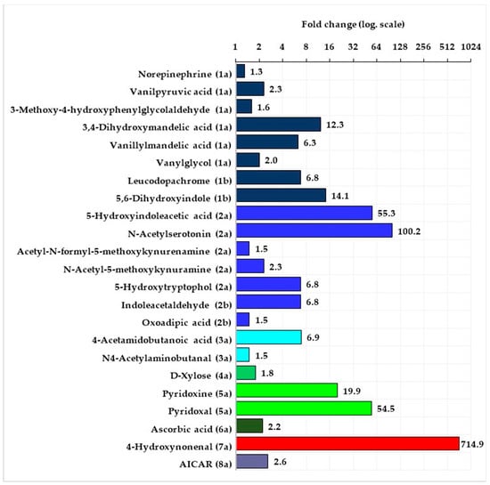 Tyrosine metabolism: (1a)—subpathway noradrenaline and adrenaline degradation, (1b)—subpathway L-dopa and L-dopachrome biosynthesis. Tryptophan metabolism: (2a)—subpathway serotonin and melatonin degradation, (2b)—subpathway L-tryptophan degradation. Arginine and proline metabolism: (3a)—subpathway putrescine degradation III. Pentose and glucuronate interconversions: (4a)—subpathway D-xylose degradation I. Vitamin B6 metabolism: (5a)—subpathway pyridoxal 5’-phosphate salvage. Ascorbate and alderate metabolism: (6a)—subpathway ascorbate recycling. Lipid peroxidation: (7a)—subpathway 4-hydroxy-2-nonenal detoxification. Purine metabolism: (8a)s—subpathway purine nucleotide biosynthesis.