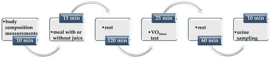 At B and after the last day of each stage, the fencers, after having been fasting all night, visited a laboratory. After emptying their bladder, the body composition was measured and then the athletes consumed a meal with a specified composition: Toast bread (120 g), cold meat—sirloin (60 g), a banana (100 g), butter mix (24 g) and dissolved in 150 mL of water: Maltodextrin (26 g) or freeze-dried beetroot juice (26 g). The basic nutritional value of this meal was as follows: Energy—787 kcal, protein—23 g, total fat— 27 g, total carbohydrate—117 g. The fencers at B and after stage D before the VO2max test consumed a meal with maltodextrin, whereas after D&J they consumed a meal with freeze-dried beetroot juice. The meal was consumed within 15 min, and 2 hours later, the VO2max test was performed. The urine samples for the metabolomic analysis were collected 1 hour after the end of the VO2max test. The protocol of the subsequent steps during the visit of the fencers in the laboratory is presented in Figure 4.