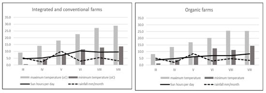 To carry out the present experiment to show the impacts of three cultivation systems on the flavonoid content and allergy potency of strawberries, one cultivar of strawberry, ‘Honeoye’ cv, was used. Plants were cultivated using three systems, organic, integrated and conventional, in farms located in the Lublin region in 2013 (Table 1). Four farms were chosen for each cultivation system. Two independent, 1 kg samples were used from each farm. All rules of organic, integrated and conventional practices were used in the selected farms. Strawberry fruits were collected in their fully ripened stage during 28–31 May 2013 from all experimental farms. The data about the weather conditions in the experimental farms are presented in Figure 1.