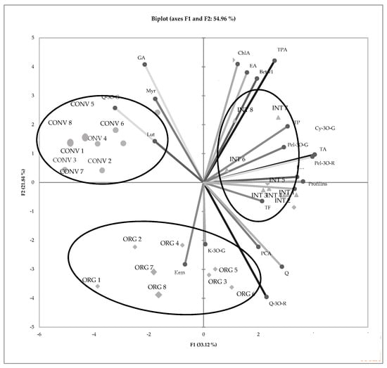The presented experiment provides very important information about the impacts of growing systems on the quality of strawberry fruits. The authors tried to use a holistic and multi-directional “from farm to fork” approach. The obtained results showed not only the content of biologically active compounds in strawberry fruits but also that the type of strawberry production can affect consumers who suffer from allergy problems. The result of the Principal Component Analysis (PCA) analysis for the strawberries produced in the three different cultivation systems showed a high overall variation rate explained by PC1 and PC2, which was 54.96% (Figure 2).