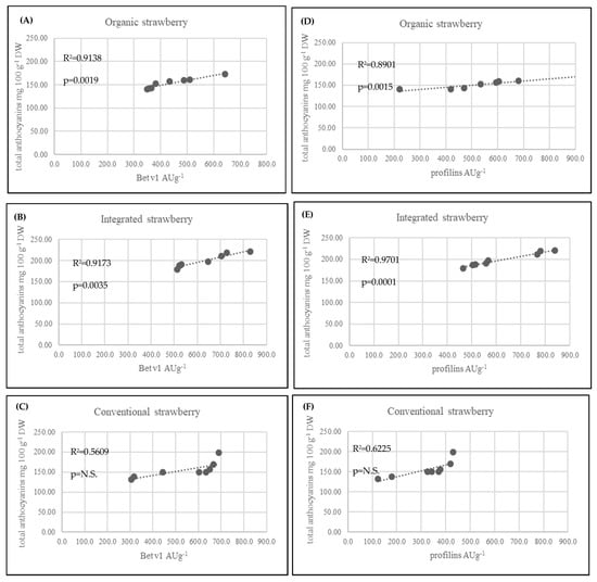 Linear correlation (Pearson’s coefficient R2) between allergenic proteins profilins, Bet v 1 and total anthocyanins in strawberry fruits from three cultivation systems.