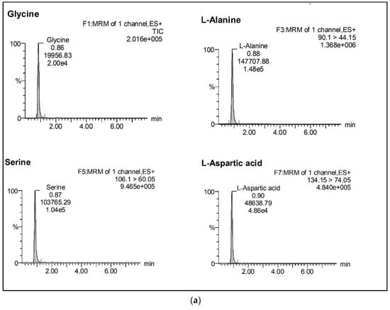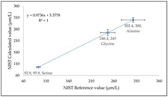 Commercially available standard-reference plasma (NIST SRM 1950) [22] was analyzed using the proposed validated method (n = 6 replicates) to evaluate the performance of the quantitative method. The concentration values for glycine, l-alanine, and serine were compared with the given standard reference values.