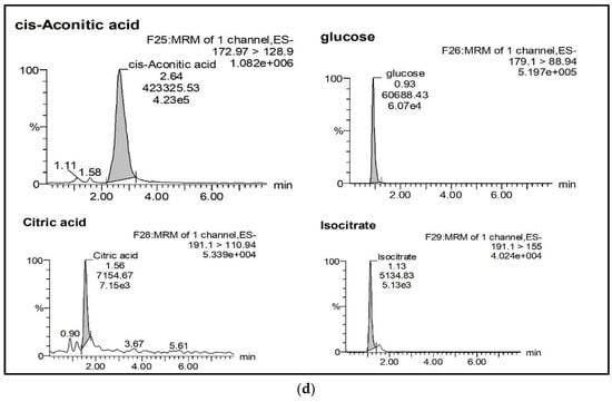 (a) Chromatogram of TCA cycle intermediate; (b) Chromatogram of TCA cycle intermediate; (c) Chromatogram of TCA cycle intermediate; and, (d) Chromatogram of TCA cycle intermediate.