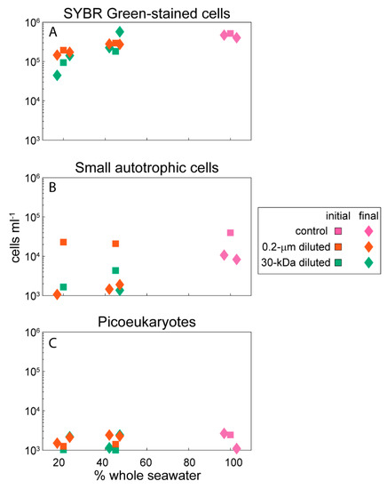 - Cram, J.A.; Parada, A.E.; Fuhrman, J.A. Dilution reveals how viral lysis and grazing shape microbial communities. Limnol. Oceanogr. 2016, 61, 889–905. [Google Scholar] [CrossRef]