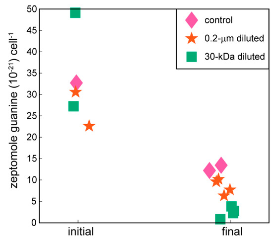 Guanine, a nucleic acid precursor, showed decreases in cell-specific concentrations at the end of the 24-hour incubation period compared to the beginning of the experiment (Figure 2, one-way ANOVA, p-value = 0.0002). At the conclusion of the experiment, cell-specific guanine concentrations averaged a 5-fold decrease compared to the initial time points. The remaining nucleic acid precursors did not show statistically significant differences between the controls and the 0.2-µm diluted or 30-kDa diluted treatments (Supplemental Figure S2).