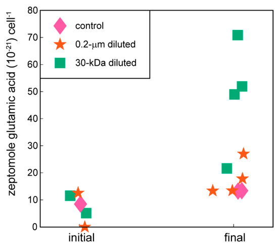 Cell-specific glutamic acid concentrations at the initial and final time points of experiment. Glutamic acid is one of the amino acids measured with the targeted metabolomics method used in this project. The remaining amino acids are plotted in Supplemental Figure S3.