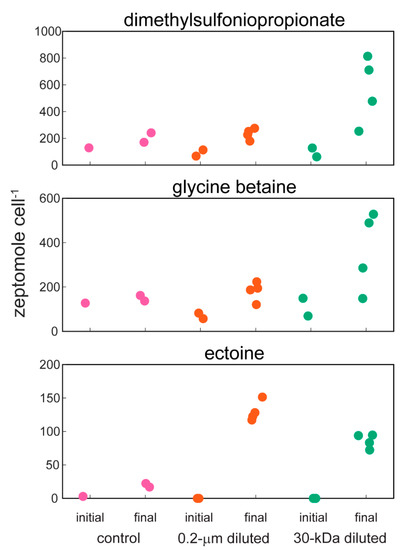 Amino acids (Figure 3) and compatible solutes (Figure 4) accumulated within the intracellular metabolite pool and these changes were statistically significant for the amino acids phenylalanine and glutamic acid in the 30-kDa diluted treatment (one-way ANOVA, p-values < 0.05 followed post hoc by Dunnett’s test, Table 2); there was no significant difference between the 0.2-µm diluted treatment and the control. Other amino acids including arginine, glutamine, and proline showed similar, but not statistically significant, trends (Supplemental Figure S3). The accumulation of ectoine, a compatible solute, was also statistically significant in both the 0.2-µm diluted and 30-kDa diluted treatments (one-way ANOVA, p-value = 0.0001 followed post hoc by Dunnett’s test, Table 2, Figure 4). Glycine betaine and dimethylsulfoniopropionate (DMSP) are two additional compatible solutes that also showed similar, albeit not statistically significant, increases over the course of the incubation experiment (Figure 4).