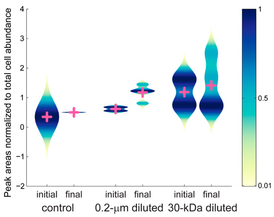 We further investigated the color modules to consider changes in the mzRT features during the experiment. We used violin plots to plot the average peak areas for each treatment within a given color group (Supplemental Figure S4). Violin plots allow us to visualize the probability density of the data at different values, in addition to presenting the mean values for each treatment. There are thousands of mzRT features in each sample and we use the violin plots to visually summarize the spread of peak areas within each treatment. Without the violin plots, we would have to present thousands of individual figures to show how each of the mzRT features present in a color module changed over time. The peak areas for the mzRT features show different patterns for each color module. For example, the mzRT features within the blue color module (Figure 6) reveal a slight increase in the mean peak areas by the final time point of the experiment in the control and the 30-kDa diluted treatments, and a larger increase in mean peak areas in the 0.2-µm diluted treatments. However, the range of average peak areas for the 30-kDa diluted treatment was broader at both the initial and the final time point compared to the range of peak areas in the 0.2-µm diluted samples. Furthermore, the 30-kDa diluted treatment at the initial time point presented a bimodal pattern in average peak area that was reduced to a skewed unimodal distribution by the final time point. A comparison across all the color modules (Supplemental Figure S4) revealed two general patterns. First, the maroon and red color modules showed the largest ranges of average peak areas, while the mint, grey, black, and pink color modules showed smaller differences in peak areas during the experiment. The peak areas can be used to infer the relative concentration of a metabolite, and increased variability in peak areas indicates increased shifts in metabolite concentrations.