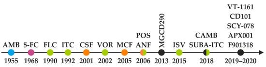 Sixty-five years of antifungal therapy. Most antifungal agents were discovered in the most recent three decades. Colored dots refer to specific antifungal drug class—polyenes (blue), pyrimidine analogues (purple), triazoles (green), and echinocandins (orange). Antifungal drugs under development and/or testing in clinical trials are marked black (see the chapter Antifungal pipeline for further information). AMB = amphotericin B, 5-FC = flucytosine, FLC = fluconazole, ITC = itraconazole, CSF = caspofungin, VOR = voriconazole, MCF = micafungin, POS = posaconazole, ANF = anidulafungin, ISV = isavuconazole, SUBA-ITC = super bioavailable itraconazole.