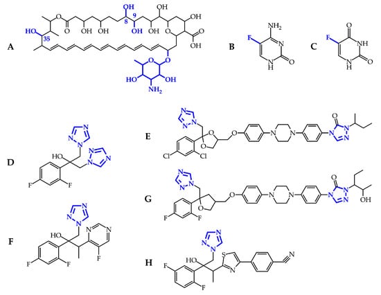 Chemical structures of the licensed antifungal drugs: amphotericin B (A); flucytosine (B), and its deaminated product 5-fluorouracil (C); fluconazole (D); itraconazole (E); voriconazole (F); posaconazole (G); and isavuconazole (H). The substructures necessary for biological activity are in blue.