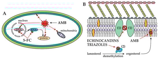 Mechanisms of actions of antifungals in the fungal cell. (A): In the fungal cytoplasm, AMB induces ROS formation resulting in the mitochondrial, biomembrane, DNA, and protein damage. Furthermore, 5-FC prevents DNA, RNA, and thus protein biosynthesis. (B): In the fungal biomembrane, 1,3-β-d-glucan synthase (1) and 14-α-demethylase (2) are inhibited by echinocandins and triazoles, respectively. Additionally, ergosterol contained in the biomembrane is sequestered by AMB, resulting in pore formation.