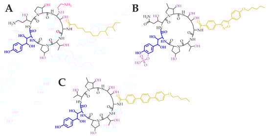 Echinocandins caspofungin (A), micafungin (B), and anidulafungin (C). The homotyrosine amino acid residue (blue) is mandatory for the inhibition of the 1,3-β-d-glucan synthase catalytic subunit Fks. The amino acid core (black) contributes to the antifungal potency and determines the physicochemical properties. Moreover, ethylenediamine, sulphate and hydroxyl groups (pink) contribute to water solubility. Specific lipophilic side chains (orange) decrease the hemolytic activity.
